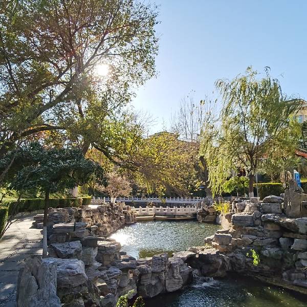 从朋友那听说了这个地方 现在是在积水潭医院里面,于是顺路过来看看。 医院需要扫健康码,测体温入园。第一次来。在里面逛了一大圈才找到。其实只要进了大门以后往东面走,绕过一个楼就是。有棍贝子府花园的介绍,还有扫二维码看详情。 整个花园面积不大,现在病人也不让出来 ,所以几乎没有人。里面小桥流水,远处还有一个塔,但是被封在里面,不能看到全景了。 整个逛一圈大概20分钟,离着不远可以顺道看看,目前景色一般,离得远不推荐特意跑一趟。