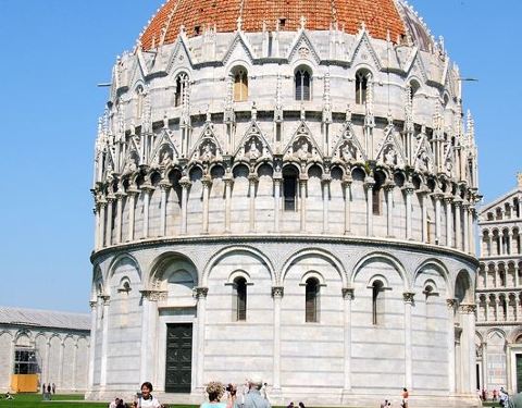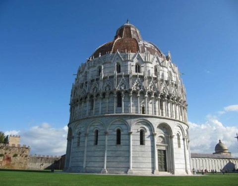 比萨洗礼堂,又名叫圣若望洗礼堂,是位于比萨奇迹广场左边的一座圆形的建筑,建筑是罗马式和哥德式风格的混合,尤其是直径 35公尺的巨大圆顶,特别显眼。洗礼堂是意大利最大的洗礼堂,礼堂内有个很大的洗礼池。而且据说这座洗礼堂内部的拢音效果和采光都很好。洗礼堂外部的装饰也很漂亮