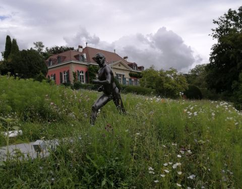 奥林匹克博物馆所在的临湖公园,绿树成荫,可以看到许多奥运雕塑。
