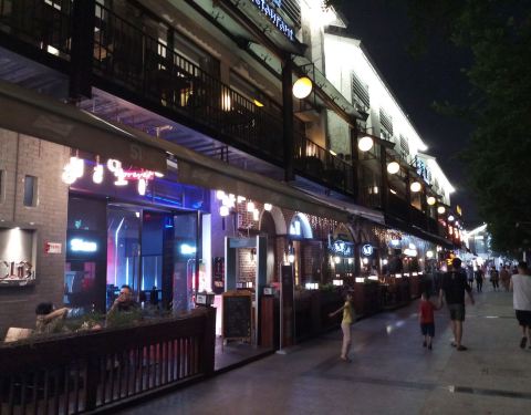 很大的一片公园,旁边搞了一个印象南塘景区,晚上来逛的游客挺多的,灯光效果还是不错。沿岸有不少商铺。美中不足是游轮没开放。
