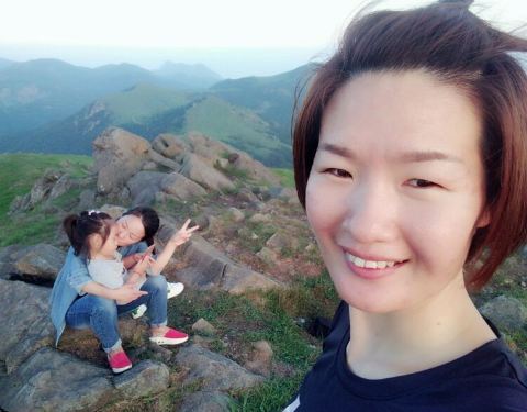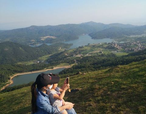 没想到是要爬山上去,我们拖着娃好不容易上去了,山上好大的风,吹得好舒服,就是一大片草场,然后山下一片水库,风景还不错吧