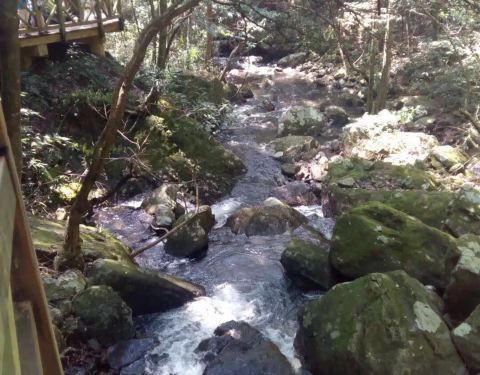 这是一个很神奇的瀑布,从上往下看瀑布,可以看到瀑布是七彩的,如彩虹一样的