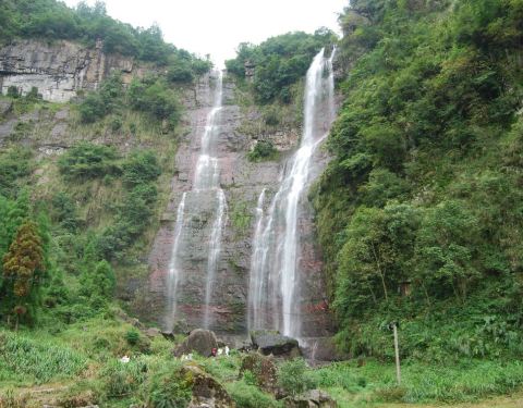 出泰顺县城约8公里处有一个以红色的石头山而称为红岩的地方,其附近的小景区也叫红岩景区,红岩景区的一个特色就在红岩隧道的出口处有二条壮观的瀑布,像二条白龙在奔腾。