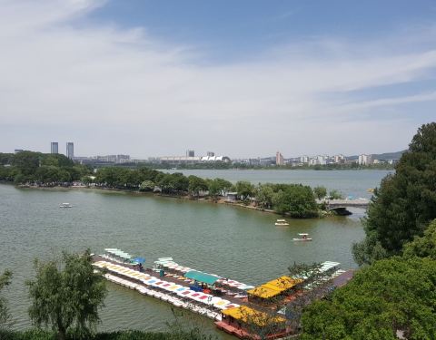 时间允许坐船游湖还是很惬意的从玄武门进来以后,南北两侧各有一个游船码头,现在都是电动船了,一般可以乘坐4-6人,根据大小收费是140-160元/每小时。 时间允许坐船游湖还是很惬意的。