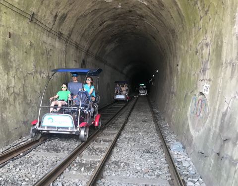 ...是一个利用废弃的铁路开发出来的旅游项目,整个脚踏车的环境很美,好多 游客在这里游玩,非常的有趣