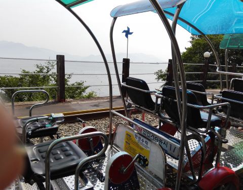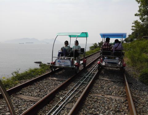 韩国人真聪明,一段废弃的铁轨,因为它紧邻大海,废物利用,装上脚踏车,开发为旅游景点。轨道全长四公里多,大部分沿海岸行走,可欣赏大海美景,还有一小部分进入隧道,往返大约一个小时。