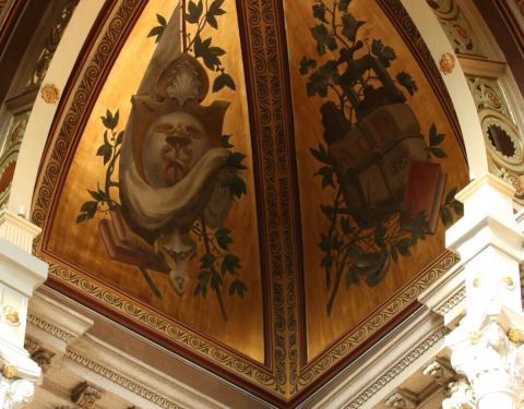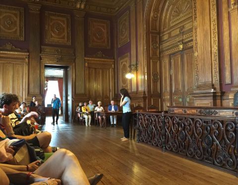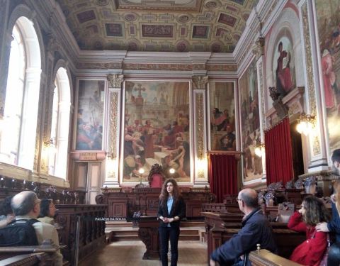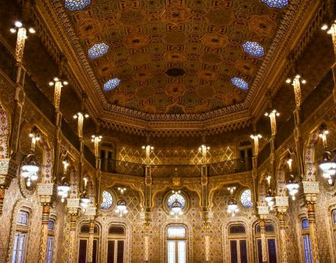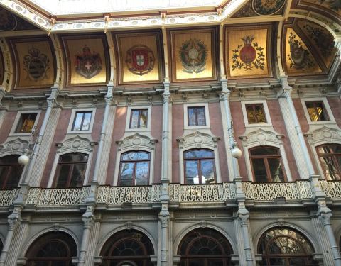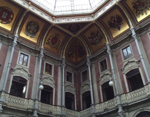 波尔图证券交易所宫是一处有着两百年历史的股票交易市场。交易所金碧辉煌,有着铂金的屋顶,鎏金的立柱,精美的壁画,仿佛置身宫殿一般。可见当时这里是多么的富有,多么的辉煌。