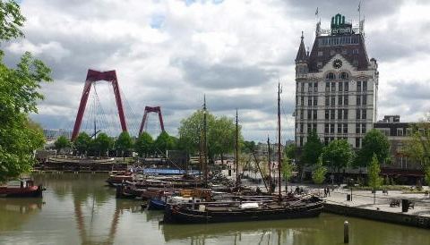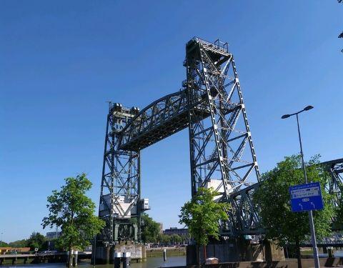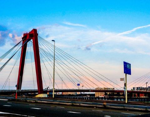 红色的一座跨包大桥,也是鹿特丹最重要的两个桥梁之一,在这个区域横跨着两座巨大的桥梁,老城区和鹿特丹新城都可以通过这,大桥全长三百多米,可以欣赏到很多的海岸线的独特景色哦。