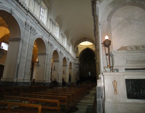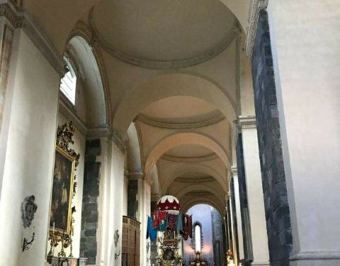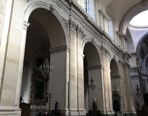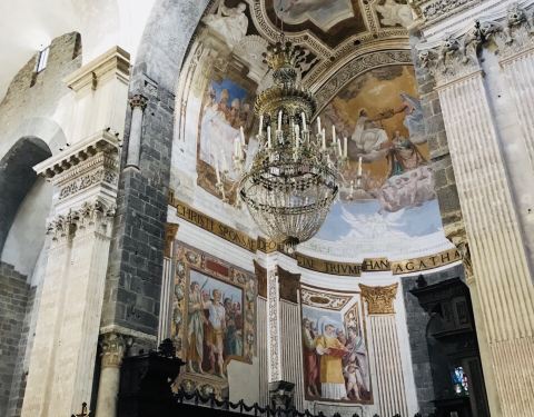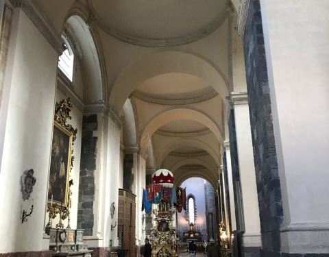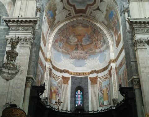 卡塔尼亚大教堂的历史真的是蛮曲折的,令人印象深刻。因为地震和埃特纳火山喷发的熔岩造成的破坏,教堂已经重建多次了。最后一次重建就是因为熔岩的破坏。教堂内部有一个巨大的穹顶,非常棒。