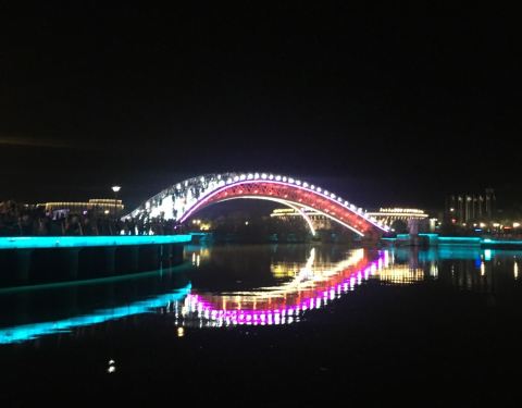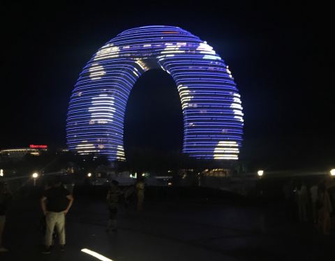 相当高档的酒店,弯弯的月亮,五彩缤纷、灯光时刻变化的景色迷人