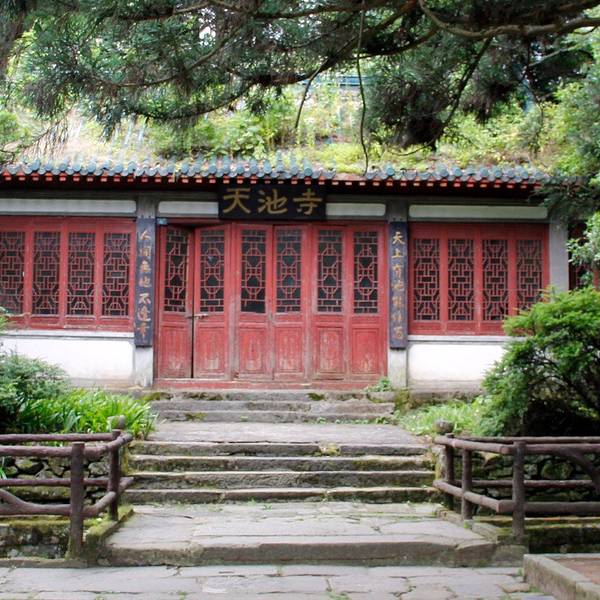 文殊台倚于天池山的西边,顶端平面呈半月形,左旁垒有上台石阶,沿台石叠护拦,下原石室五楹,石木水泥混合结构,说是后人表其双手插石成池立台供“文殊菩萨”像予以纪念。