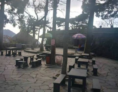 庐山风景点内大天池景点旁的小驿店,那座石房就是是文殊台,在这门口在石椅什么,可以休息吃自带食物,或是店中点壶茶在此冲泡,石房顶是文殊观景台。