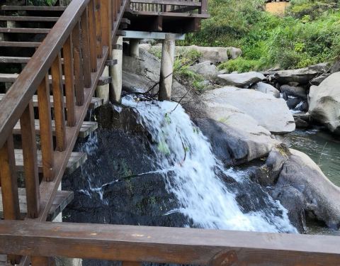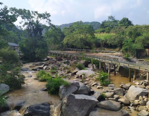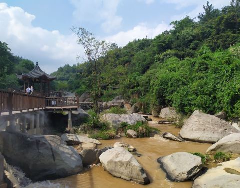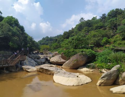 我们从外地来的,时间只够来梅岭,所以选择了铜源峡景区和泊园茶村。铜源峡景区的山水,可能是才下过雨我们从外地来的,时间只够来梅岭,所以选择了铜源峡景区和泊园茶村。铜源峡景区的山水,可能是才下过雨?水色不是清的,是黄泥汤样的,在乱石中轰鸣穿过,也别有一番情趣。