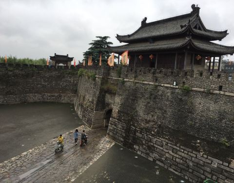 从淮南王墓去往宾阳门,原以为也是门可罗雀,没想到刚开到南门的时候,我就发现自己大错特错。不但小城人口众多,外地来的游客也是比比皆是。城墙的城内一侧是斜坡,种了草皮,人们可以方便地上下。宾阳门显然保留了原来的面貌,光溜溜的地面,爬满城楼的植物,破损的墙砖,貌似门头的字也是原来的,一切都很有味道。城门是开放的,走过瓮城就到城门外了,当地居民也可以通行非机动车。城墙外面就是宽阔的护城河,水质应该也是不错,有不少人在钓鱼。进宾阳门的城楼是要收费的,估计也没啥名堂,没花那冤枉钱。整个城墙保护得相当不错,尤其对于这样的小县城,人口密度又这么大,实属不易。