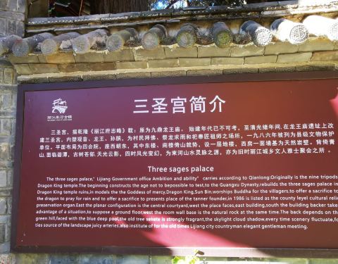 三圣宫位于束河古镇的西北侧,九鼎龙潭旁边,是一座始建于清代的楼阁寺庙。寺庙呈四合院的形式,东楼直接邻水,楼上有三面的回廊,可以凭栏远眺,外面的景色十分漂亮。寺院的其他几个殿都供奉着神像,北楼是龙王,南楼供奉着名人孙膑,因为在历史传说中是孙膑发明了皮靴,被尊为皮匠的始祖,而束河正是皮匠之乡,所以才有了供奉孙膑的庙宇,十分独特。