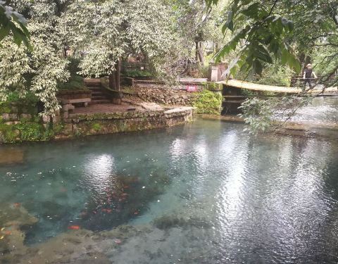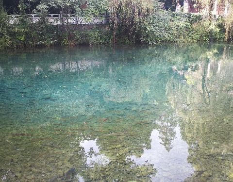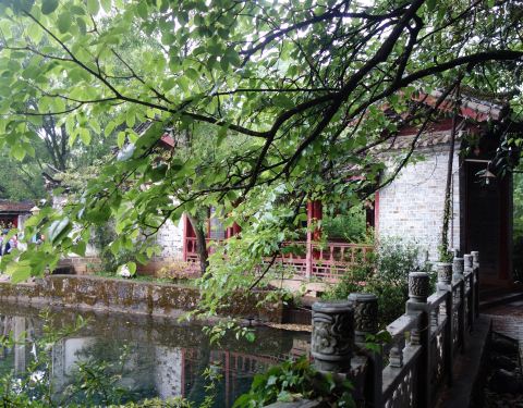 28日上午抵达丽江,在大众点评上找到朵颐餐吧,一路由住地跟随导航过来,几乎横跨了整个古镇。午餐用的很满意。餐吧出来,导航上显示附近就是九鼎龙潭和龙泉寺,于是沿着束河水流往九鼎龙潭方向行进。边上就是三圣宫(龙泉寺)。潭水清澈见底。许是暑假临近尾声,游人不多,间或下着雨也没扫了兴致。