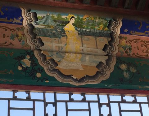 “夹镜鸣琴”四个字出现在一座重檐四坡攒尖顶桥亭上。“夹镜”指亭的两侧各有水面,波平如镜。果然,亭子一侧水面宽广,有小舟自横,另一面则为荷花池,早春时节遍布残枝败叶。“鸣琴”指瀑布落下,水波激荡,如鼓琴瑟,这个,周围真的没有。亭内四周的藻井上均有仕女图,也没有一位作抚琴状。