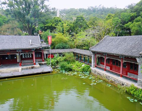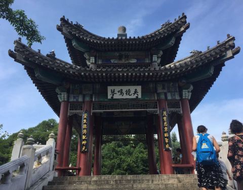 夹镜鸣琴是圆明园的名景之一,如今也被仿制到园明新圆中。这是一个湖边的亭子,位于高处,除了可以在这里小憩以外,还可以在高处欣赏圆明新园的湖景。挺不错的。