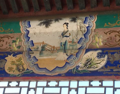 “夹镜鸣琴”四个字出现在一座重檐四坡攒尖顶桥亭上。亭内四周的藻井上均有仕女图,也没有一位作抚琴状