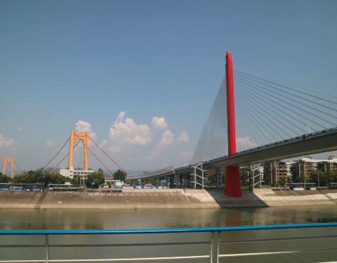 跨越长江,连接江心一小岛和江岸的大桥。站在桥上,俯看江景和两岸风光,不禁感慨岁月如梭。此桥七十年代建成,只进行了一次大型维修。