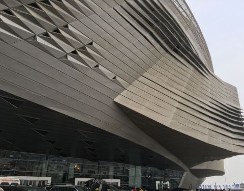国际会议中心位于大连东港,抵近海岸线。建筑类似海螺的抽象体,成为海岸线的重要标志物