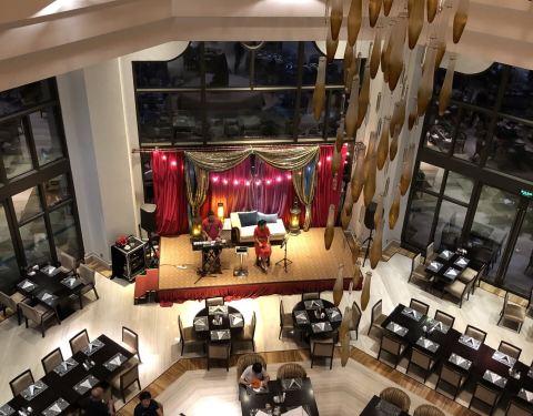 清远狮子湖喜来登度假酒店。酒店的装修风格非常的阿拉伯风,圆顶建筑,灰色的墙漆