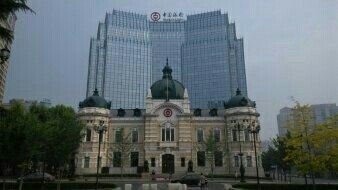 中国银行大连分行,位于中山区中山广场北面,前面欧式建筑风格,宏伟壮观,后面现代的高楼大厦,威武雄壮。
