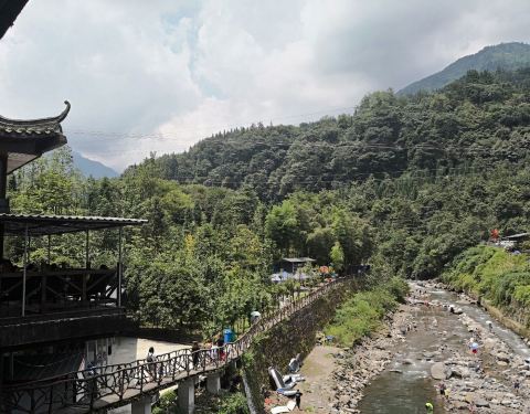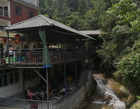 #2018夏日蓥华山避暑游# 什邡红峡谷是本次活动的最终点,听说这里环境好,空气佳,农家乐多,我妈一心想来感受一下。 过了红峡谷的山门,沿着山路向前开,沿途太多农家乐了,有规模小的农家小院,有规模大的酒店,供选择的也很多。有的农家乐靠山,周围植被茂密,有的农家乐靠水,可以玩水但是湿气比较重,越往山里走,温度约低空气越好。 找了一个靠水滴平坝,周边的农家乐不少,随便选了一家坐下来休息,咨询了价格,这里平时100元一个人,包住宿和三顿饭,周末就是120,价格也算合理,重点是凉快。 下河滩的步道和走进山间的步道都还是修不错,在河滩上修了个三层阁楼供游客喝茶,10元一杯,阁楼正好在风口上,做起喝茶只凉快,安逸