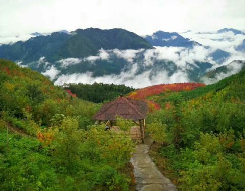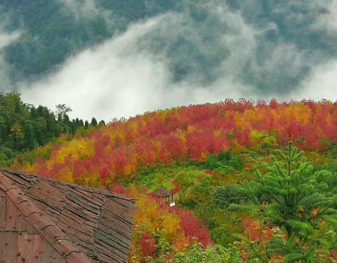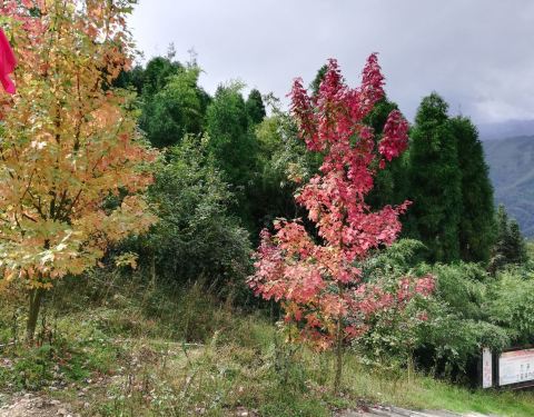 深秋红峡谷,上山赏红叶。观百年银杏树满山黄。