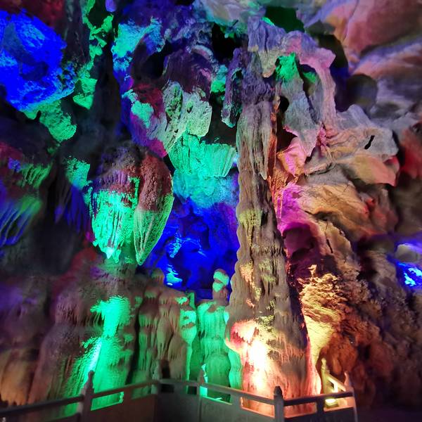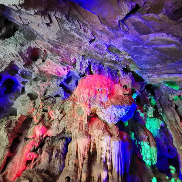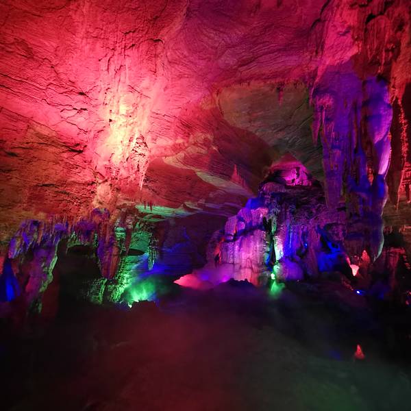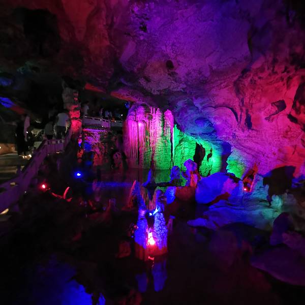天河潭景区内溶洞,装饰了各种彩带灯,看上去就像银河一般