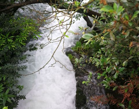 花溪公园的一个景点,桥下有瀑布,一侧是平静的河水,水草丰满,一侧是湍急的瀑布,河水潺潺。