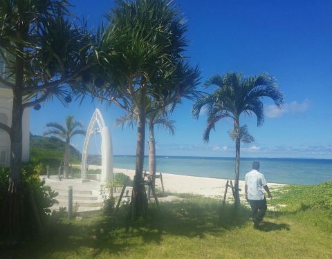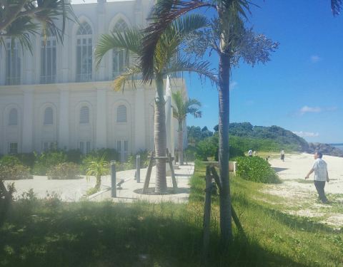 就在从那霸到海洋博公园的半路上,一个叫残波岬的地方。一个美丽的白色小教堂。门脸不大却很深。这个教堂名气很大,很多国内的情侣也在这里举办婚礼。蓝天白云碧海白教堂,谁不喜欢呢?