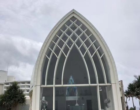 艾葵雅教堂介绍:艾葵雅教堂以“水”与“恩赐、优美”为理念,是一座由琉球石灰岩柱构建,彩绘玻璃装饰点缀,以海浪为主题设计而成的纯白教堂。