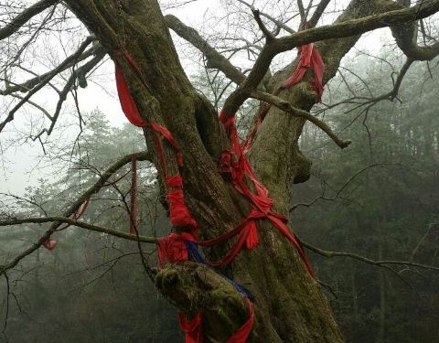 在九华的后山,百分之八十的香客都不知道。驱车驶离大路走很长一段碎石路才能到达。路过普渡寺、老槐树登百多级台阶才能到达。山腰上一道天然石涯缝隙,不过40公分,仅能瘦子通过。入口见有小庙,甚至少见的因为特别一眼井水质甘洌,旁边还有九华仅有的供奉龙王的小庙。去的时候气温在零下,加上大雾,看到了美丽的雾凇景观