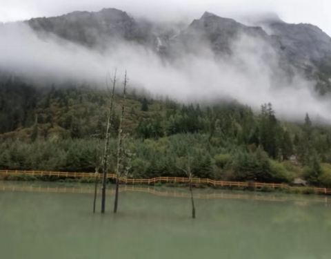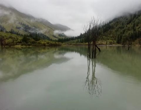 上下干海子位于四川省小金县四姑娘山景区,一个是天然湖,一个星期堰塞湖,枯树与活树立在湖中,疏密...