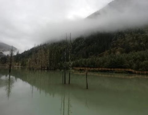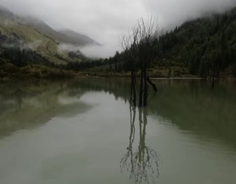 上下干海子位于四川省小金县四姑娘山景区,一个是天然湖,一个星期堰塞湖,枯树与活树立在湖中,疏密有致,错落有致,倒影抚楣,婆莎舞姿,别有风情。