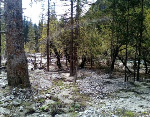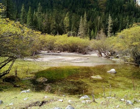 位于长坪沟景区内,这里已经过了木栈道尽头,需要走马道到大本营附近,所谓“海子”就是两个比较开阔的水塘,到枯水期就干涸了。