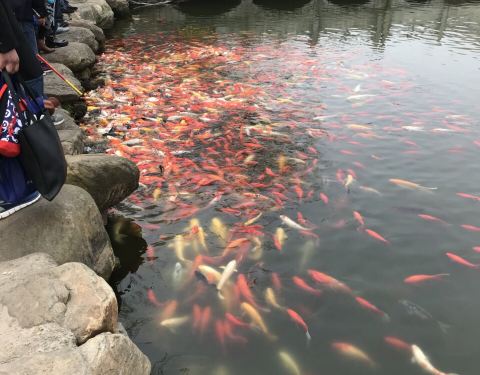 不让用自己的东西喂 只能喂他们旁边摊位卖的鱼食 还挺贵 不过我们买了喂鱼好多鱼 宝宝很兴奋 鱼真的是又大又多 一群群游过去