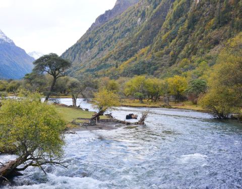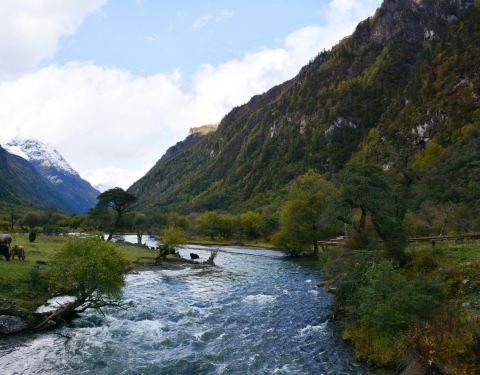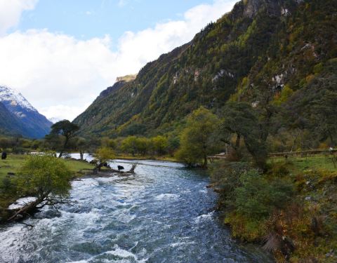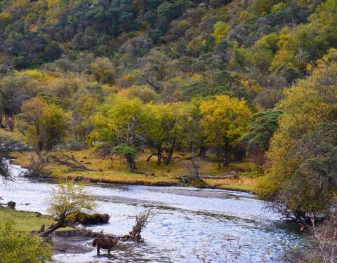 景点有河流,草甸,沙棘林和放养的牦牛,构成了一幅恬静的田园画和诗画般的奇境