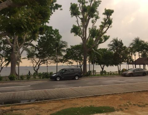 樟宜海滩离樟宜机场很近,樟宜海滩公园道比较宽,海水很蓝,可以看见远处的军舰。