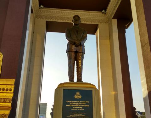 西哈努克的铜像就矗立在塔中,注视着他的国民在日益发展中生活得越来越好