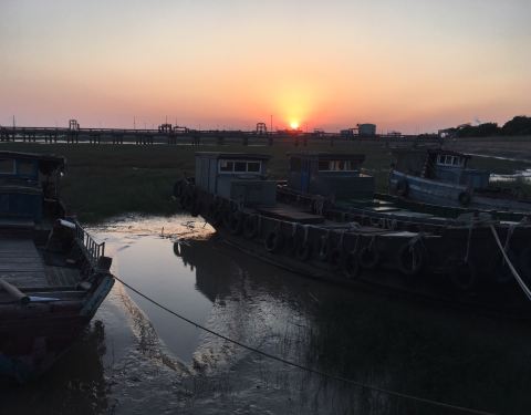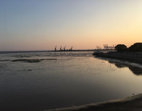 离海边很近的一个开放式公园,傍晚时分看日落,夕阳照在泥滩上,天空红彤彤一片,美不胜收