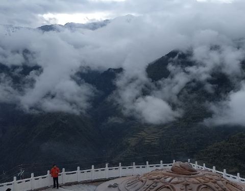 观音桥是很多川西路线的第一夜休息点,来到这里,对于没有求神的人,第二天一大早去参观观音庙也是非常值得的,寺庙周围环绕着云朵,如仙境一般。红墙和蓝天简直是绝配,在有一缕阳光就更美了