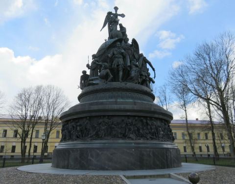 俄罗斯千年纪念碑竖立在大诺夫哥罗德克里姆林宫里,整座千年纪念碑上一共雕刻了俄罗斯历史上的统治者、英雄、文化名人共128个