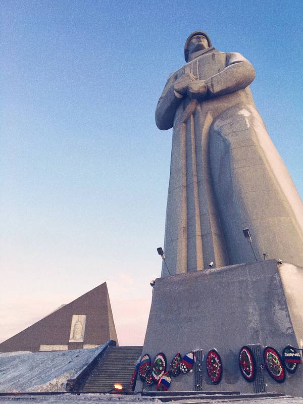 阿廖沙是位于摩尔曼斯克城市北面小山上的一座灰色的混凝土士兵雕像,纪念碑为纪念二战期间摩尔曼斯克人民英勇斗争和顽强不屈而建,高达40米。碑座下放置的鲜花覆盖着白雪,露出的一抹红色显得格...【阿廖沙雕像 】