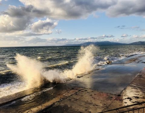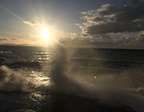 抠抠缩缩吹着猛烈的海风蹲守在库萨达斯海边2小时就为等爱琴海的日落…海风在空无一人的淡季海滩上冻...