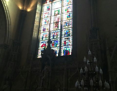 ...0年的历史,非常的古老,教堂内有很多名人的坟墓和雕塑,阳光透过彩绘玻璃透进教堂,非常的神秘魔幻