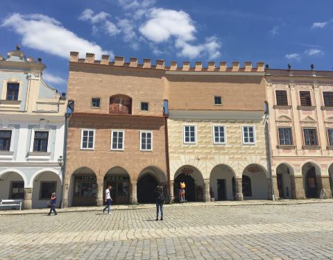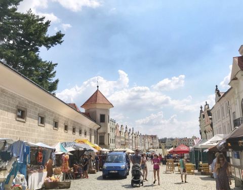 泰尔奇位于捷克南部,非常安静的小镇。我们是离开维也纳,前往布拉格时,顺便去的,在小镇吃了个午饭。 镇子当真不大,除了著名的水城堡,就是一条相当漂亮的主街,漂亮的建筑,有着马卡龙色的外观,以及绝不相同的屋顶,这种样式也是小镇的一大特色。建筑的一屋是回廊,廊下各色酒吧、餐馆以及商铺。与建筑平行的街道上有一长排摊档,出售的大多为当地人自制的商品,有手工编织、腌的酸菜什么的,商贸并不兴盛,主要原因是这里并没有大量的游人。当地人也是有一搭无一搭的。广场上还有一个纪念柱 小镇的消费并不高,如果想安静地休闲,这里比CK适合