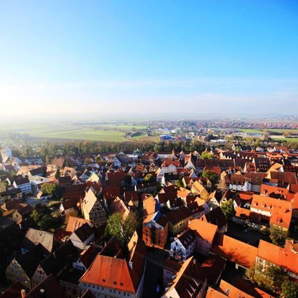 圣格奥尔格教堂位于小镇的中心,塔楼高90米。可以登上教堂的塔楼,俯瞰整个圆形的小镇,围绕着圆形小镇的是建于14世纪的一圈城墙。