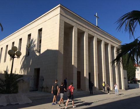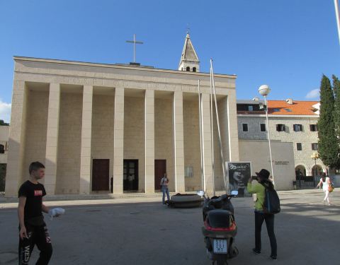 1893年建立的斯普利特国家大剧院,是克罗地亚古老的剧院之一。欧洲多国古老的剧院都成了景点。我们只是看了外观,黄色的建筑很醒目,不少人在此拍照。剧院旁边的一座教堂外观好现代,真的少见这种建筑风格的教堂。